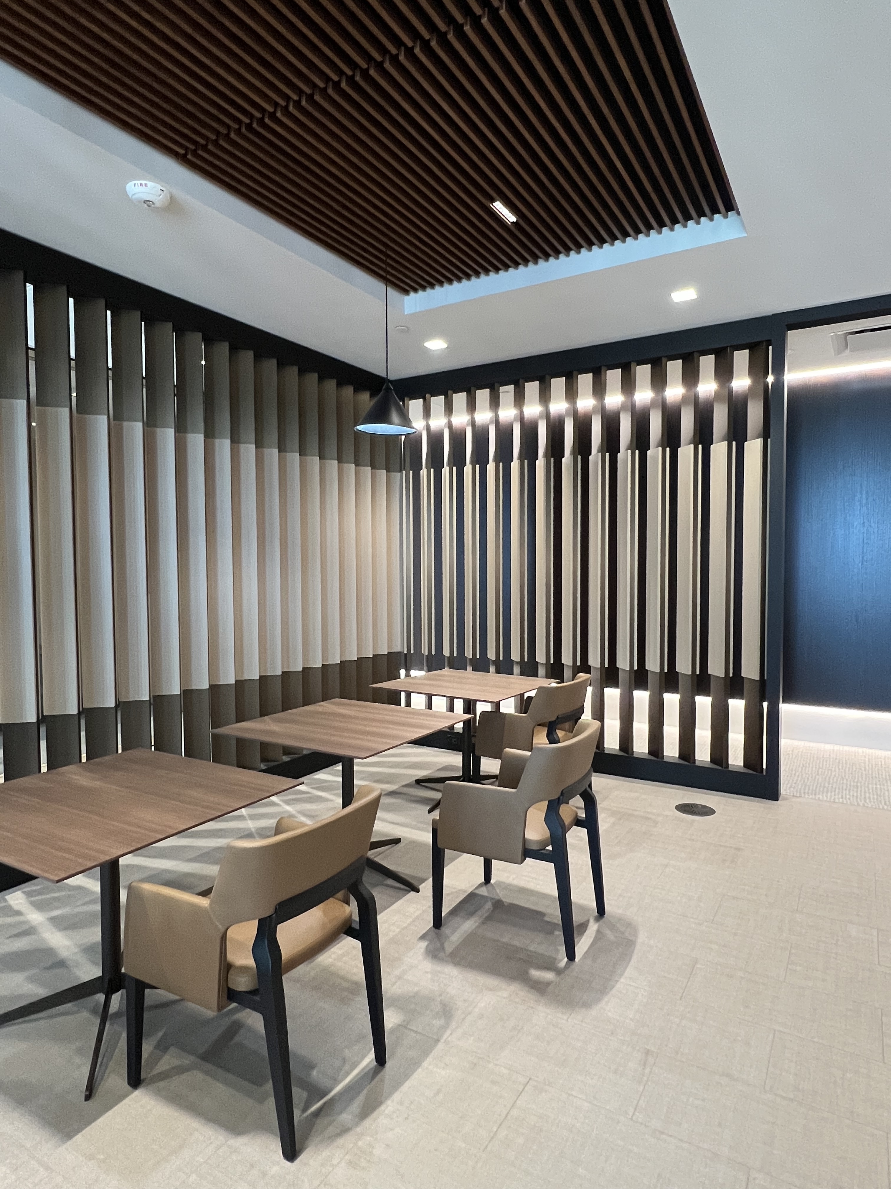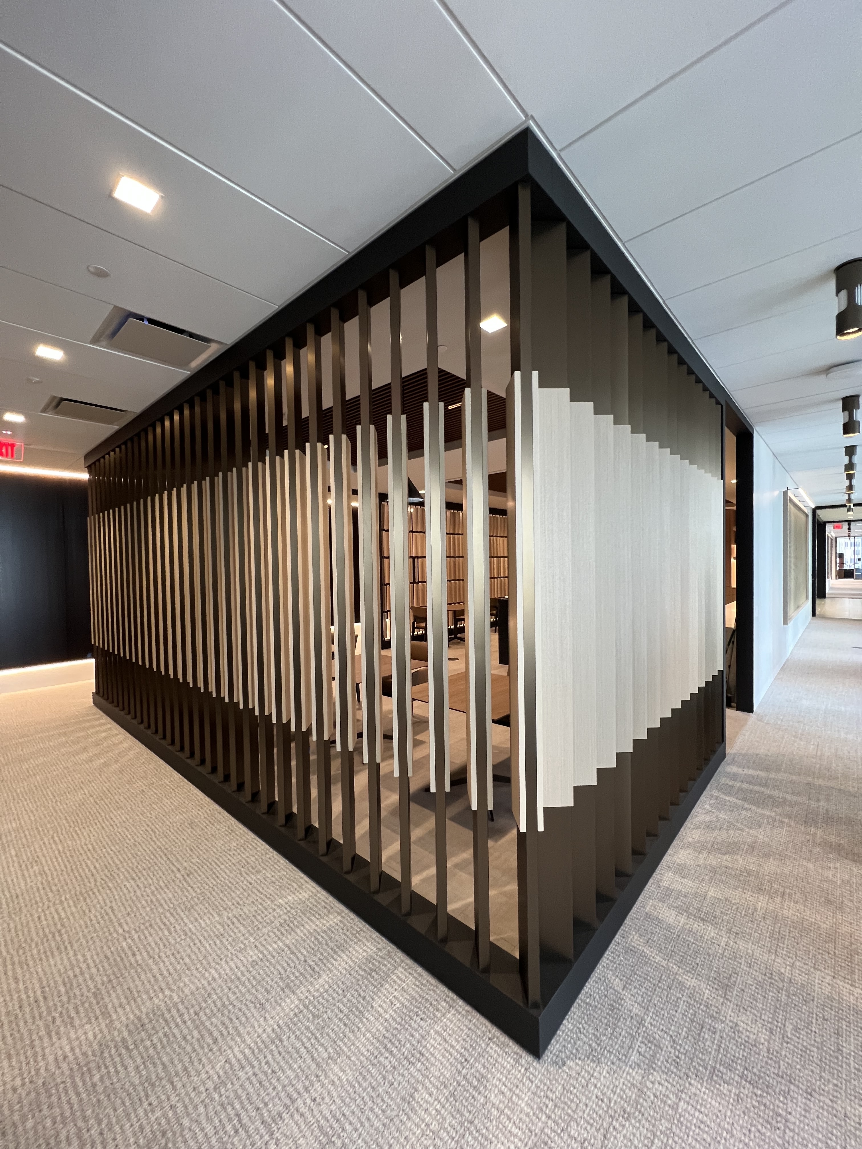 Collaborated with HOK to realize a high-concept feature wall installation featuring fins with a sophisticated aesthetic for a major oil company’s employee lounge.